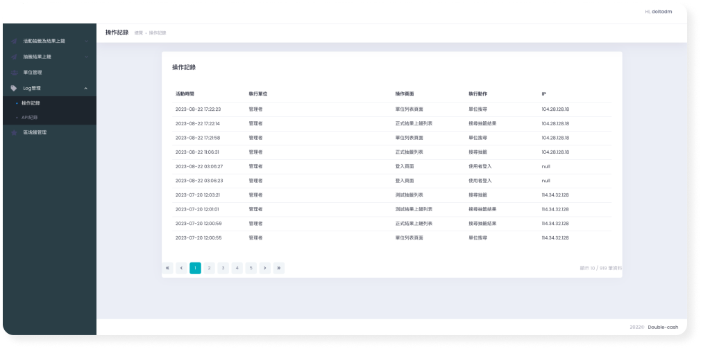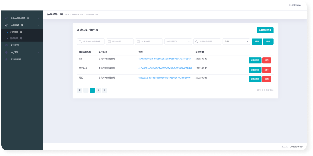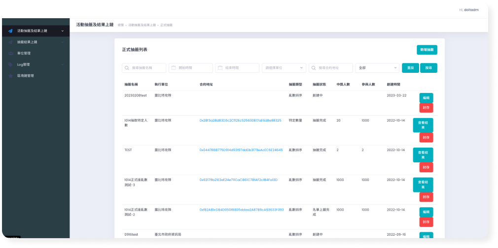 其1. 統計功能,顯示各項目(投票、抽籤等)上鏈情形,可針對服務、時間進行篩選統計。